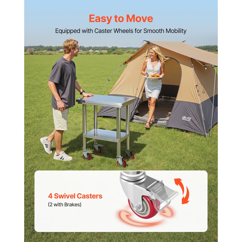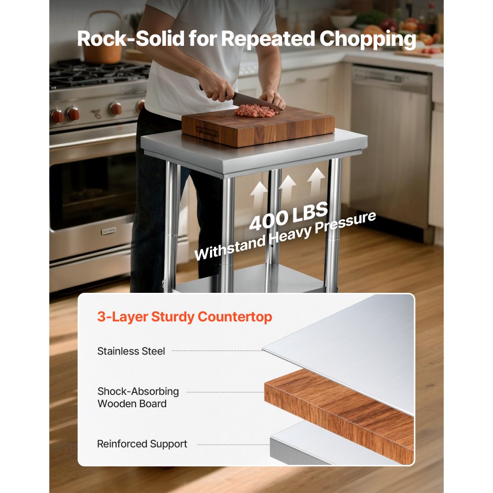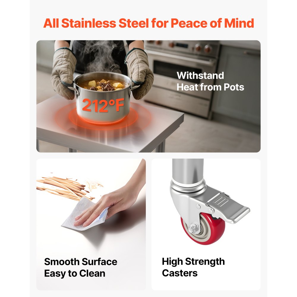 Υψηλής ποιότητας ανοξείδωτο ατσάλι: Το τραπέζι εργασίας από ανοξείδωτο ατσάλι διαστάσεων 24 x 18 x 34 ιντσών είναι κατασκευασμένο από ανοξείδωτο ατσάλι SUS201 για την επιφάνεια, τα ράφια και τα πόδια. Είναι ανθεκτικό στη σκουριά, έχει κομψή εμφάνιση και καθαρίζεται εύκολα με ένα απλό σκούπισμα. Σταθερό και ανθεκτικό: Το πάνω ράφι χωράει έως και 200 κιλά, το κάτω 150 κιλά, παρέχοντας άφθονο χώρο αποθήκευσης για τα προμήθειά σας. Με 4 περιστρεφόμενους τροχούς (2 με φρένα), το τραπέζι εργασίας προετοιμασίας φαγητού παραμένει σταθερό και μετακινείται εύκολα όπου το χρειάζεστε. Ρυθμιζόμενο ύψος: Το ρυθμιζόμενο ράφι τριών επιπέδων του μεταλλικού τραπεζιού προετοιμασίας σάς επιτρέπει να προσαρμόσετε τον χώρο για αντικείμενα όλων των μεγεθών. Απλώς ρυθμίστε τις βίδες ώστε να χωράνε εύκολα ψηλά ή κοντά είδη. Ευέλικτες εφαρμογές: Πέρα από την αποθήκευση, το τραπέζι προετοιμασίας μας μπορεί να χρησιμοποιηθεί για το κόψιμο λαχανικών, το ζύμωμα ζύμης, το κόψιμο κρέατος και άλλες εργασίες που σχετίζονται με την κουζίνα. Είναι επίσης κατάλληλο για μπαρ, εστιατόρια, ξενοδοχεία, μπουφέδες, εκδηλώσεις catering, σχολεία ή αίθουσες διαλειμμάτων γραφείων. Πρακτικά μεγέθη: Διατίθεται σε πολλά μεγέθη για να ταιριάζει στον χώρο σας. Το τραπέζι μας από ανοξείδωτο ατσάλι είναι ιδανικό για κουζίνες, γκαράζ ή ανακαινίσεις σπιτιών. Μετρήστε την περιοχή σας πριν από την αγορά για άψογη εφαρμογή.