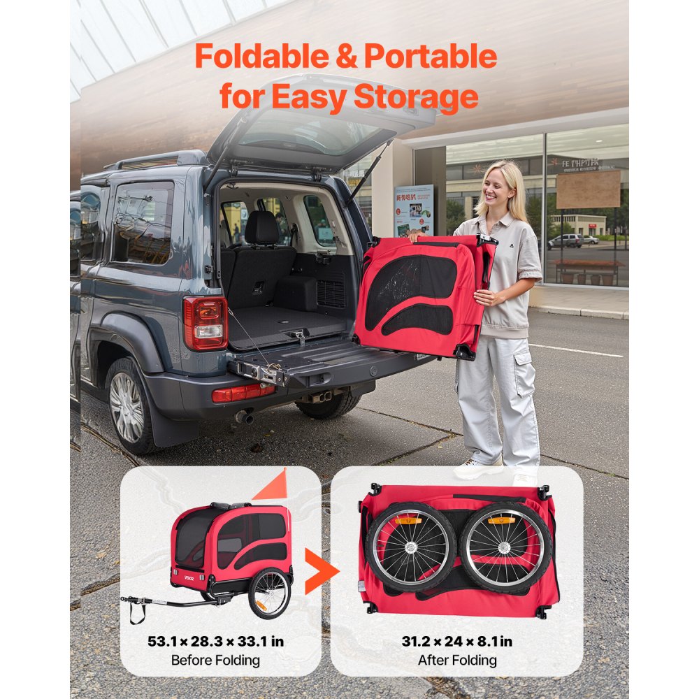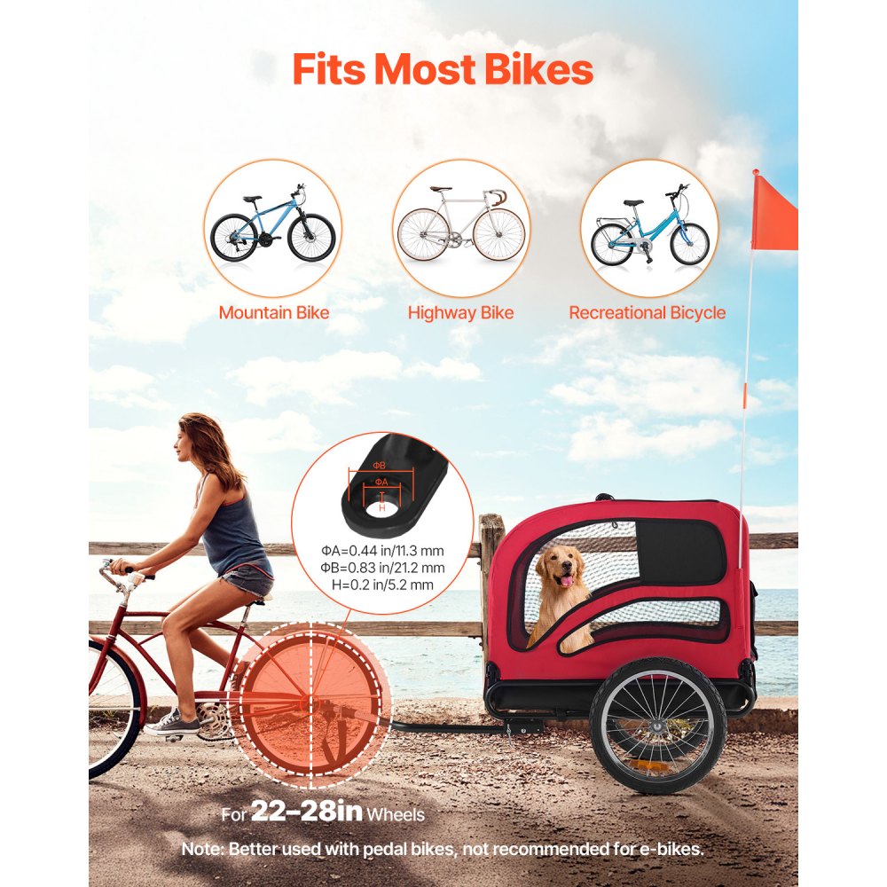 Ζεύκτης γενικής χρήσης για τα περισσότερα ποδήλατα ενηλίκων: Αυτό το τρέιλερ ποδηλάτου για σκύλους συνδέεται εύκολα σε ποδήλατα πίσω τροχών 22-28 ιντσών με τον παρεχόμενο ζεύκτη - γρήγορη εγκατάσταση, σταθερή ρυμούλκηση Ευρύχωρη και άνετη καμπίνα: Με εσωτερικό χώρο 31,9 x 21,9 x 25,2 ίντσες, η καμπίνα του καροτσιού μεταφοράς ποδηλάτων παρέχει άφθονο χώρο για μεσαίου έως μεγάλου μεγέθους σκύλους. Τα κατοικίδια μπορούν να ξαπλώσουν ή να γυρίσουν άνετα, και η πίσω πόρτα εξασφαλίζει εύκολη είσοδο και έξοδο. Προστασία από τις καιρικές συνθήκες και αερισμός: Το μπροστινό διαφανές πτερύγιο PVC του τρέιλερ ποδηλάτου-σκύλου προστατεύει από τον αέρα και τη βροχή, ενώ τα πλέγματα παρέχουν εξαιρετική ροή αέρα και ορατότητα. Το κατοικίδιό σας παραμένει στεγνό, δροσερό και ήρεμο, με προστασία από ενοχλητικά ζωύφια. Ασφαλής οδήγηση με έξυπνες λειτουργίες: Το ενσωματωμένο λουρί κρατά το κατοικίδιό σας ασφαλές μέσα στο τρέιλερ σκύλων. Ένας οπίσθιος ανακλαστήρας και μια σημαία βελτιώνουν την ορατότητα, ενώ το ενισχυμένο ατσάλινο πλαίσιο παρέχει αξιόπιστη προστασία στο δρόμο. Πτυσσόμενο πλαίσιο, αποσπώμενοι τροχοί: Αυτό το τρέιλερ ποδηλάτου για κατοικίδια διπλώνει σε δευτερόλεπτα για συμπαγή αποθήκευση ή μεταφορά στο πορτμπαγκάζ του αυτοκινήτου σας - ιδανικό για ταξίδια ή καθημερινή χρήση.