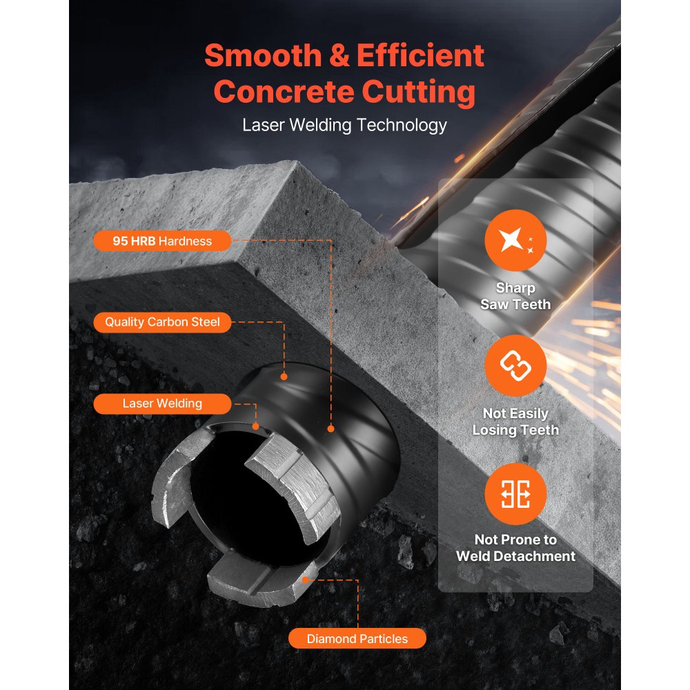 Υψηλή συμβατότητα: Αυτό το σετ περιλαμβάνει ένα τρυπάνι με πυρήνα διαμέτρου 1-1/2 ίντσας, τρεις προσαρμογείς και ένα τρυπάνι-οδηγό, καθιστώντας το συμβατό με τα περισσότερα τυπικά τρυπάνια και κρουστικά δράπανα. Συνδυάστε ευελιξία και ευκολία για διάφορες εργασίες. Ακριβής τοποθέτηση: Το διαμαντένιο τρυπάνι ξηρής διάτρησης διαθέτει πιλοτικό τρυπάνι, δεν χρειάζεται προτρύπημα. Η αιχμηρή άκρη διεισδύει γρήγορα στην επιφάνεια, επιτρέποντας ταχύτερη και ακριβέστερη τοποθέτηση, εξασφαλίζοντας ομαλή λειτουργία χωρίς αλλαγή τρόπου λειτουργίας. Ανθεκτικό και στιβαρό: Κατασκευασμένο από ποιοτικό ανθρακούχο χάλυβα με συγκόλληση υψηλής ακρίβειας, αυτό το τρυπάνι με πυρήνα σκυροδέματος διαθέτει σκληρότητα 95HRB. Αντέχει στη συσσώρευση θερμότητας κατά τη διάρκεια τρυπήματος υψηλής ταχύτητας ή εργασιών ξηρής λειτουργίας, αποφεύγοντας την αποκόλληση της λεπίδας και ενισχύοντας τη μακροζωία. Υψηλής Απόδοσης Τρύπημα: Τα τρυπάνια μας για σκυρόδεμα διαθέτουν δόντια με ακριβή τροχισμό για ομαλές άκρες χωρίς γρέζια και ταχύτερες, ακριβείς κοπές. Το κέντρο των δοντιών ευθυγραμμίζεται με τον άξονα εγκατάστασης, αντιστέκεται στην ταλάντωση ή τη μετατόπιση κατά την περιστροφή υψηλής ταχύτητας. Ευρεία εφαρμογή: Ιδανικό για διάτρηση σε οπλισμένο σκυρόδεμα, κόκκινο τούβλο, σκυρόδεμα και αφρώδες τούβλο. Αυτό το τρυπάνι πυρήνα χρησιμοποιείται συνήθως σε εγκαταστάσεις κλιματισμού, υδραυλικές εγκαταστάσεις, κιγκλιδώματα σκαλοπατιών, αυτοκινητόδρομους, αεροδρόμια και διάφορες κατασκευές.