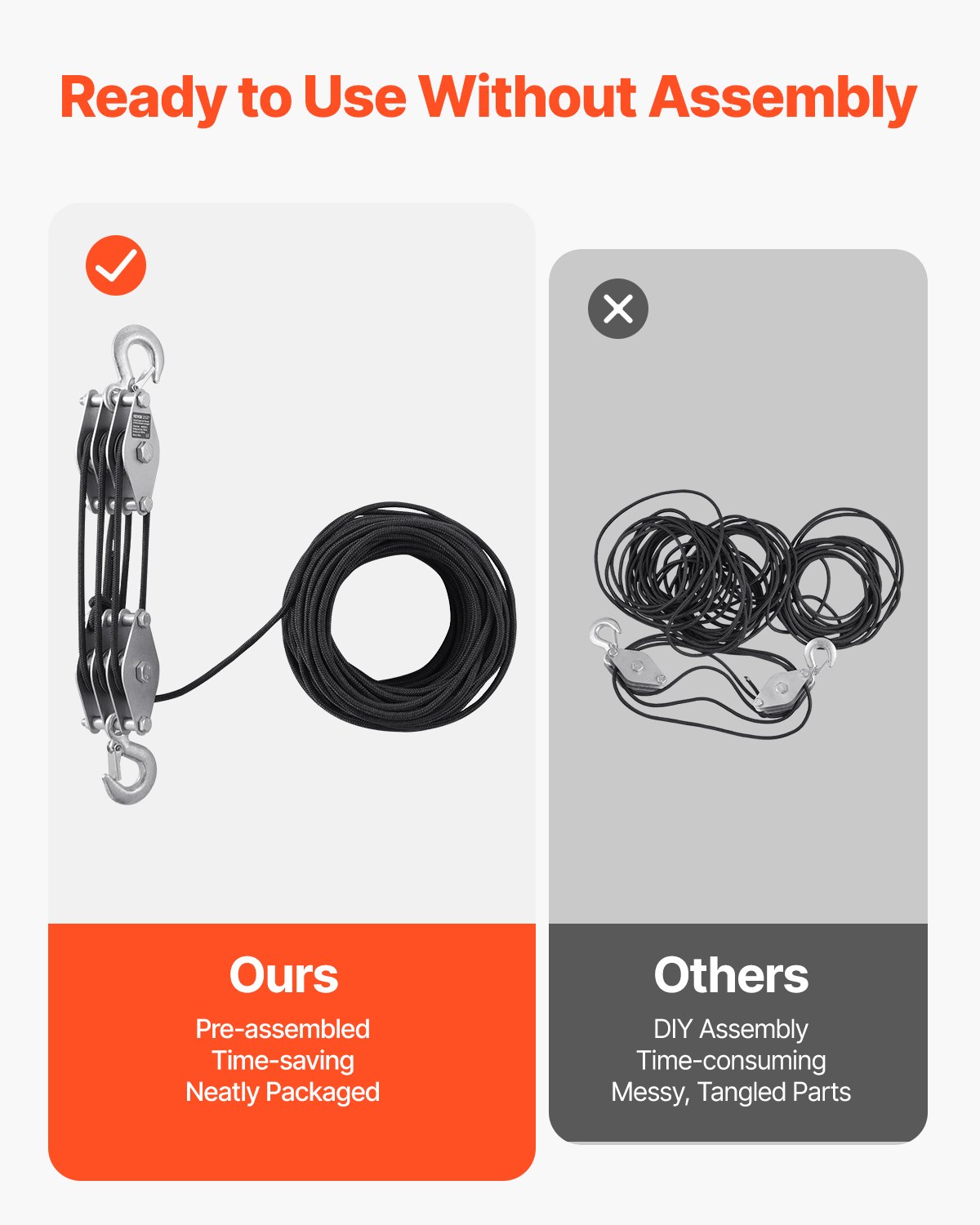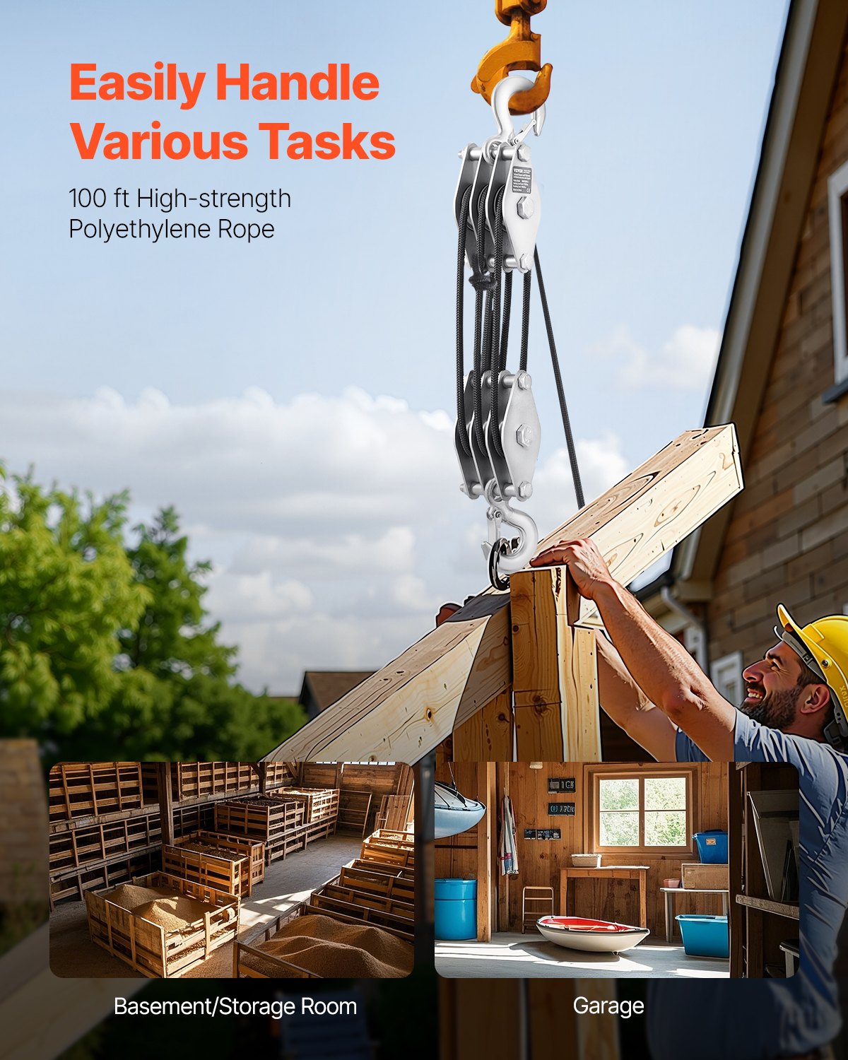 Ισχύς βαριάς ανύψωσης: Κάθε ανυψωτικό σχοινιού διαθέτει ένα σετ από τρεις μεταλλικές τροχαλίες και ισχυρό σχοινί, ικανό να ανυψώσει έως και 4400 λίβρες (2Τ). Με συνιστώμενο φορτίο εργασίας 1100 λίβρες (500 κιλά), μπορείτε να αντιμετωπίσετε εύκολα εργασίες ανύψωσης βαρέων, όπως εκτροφή ζώων, δέντρων, επίπλων, ποδηλάτων, μοτοσικλετών και εργαλειοθήκης. Δοκιμασμένο για αξιόπιστη απόδοση, είναι το ιδανικό σας για εύκολη ανύψωση.