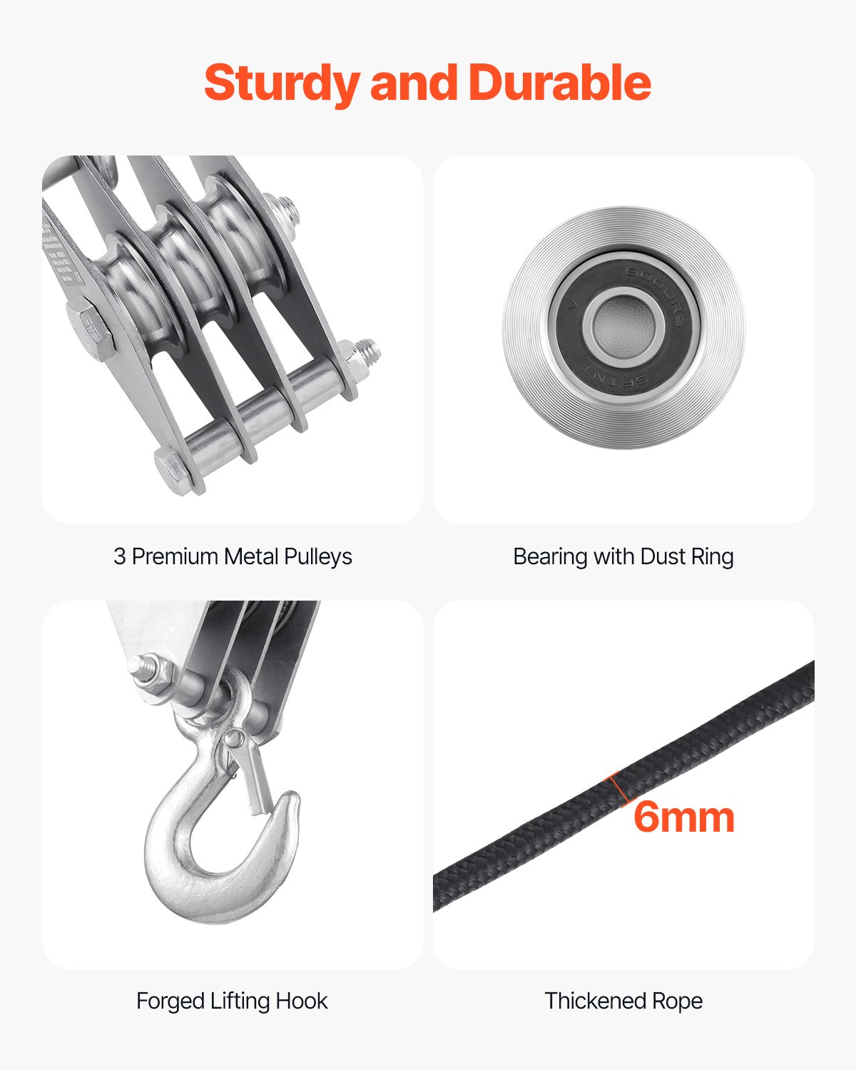 Long Rope Reach: Εξοπλισμένο με ανθεκτικό σχοινί 100 πόδια, αυτό το σύστημα τροχαλίας ανυψωτικού σχοινιού διαθέτει σχοινί από πολυεστέρα 6 mm που είναι ανθεκτικό στη φθορά και ανθεκτικό στο σκίσιμο. Είναι ιδανικό για ανύψωση σε διάφορα περιβάλλοντα, όπως γκαράζ, κάμπινγκ, βάρκες, εργοτάξια, κυνήγι, κοπή δέντρων ή σοφίτες. Η αντοχή του σχοινιού εξασφαλίζει αποτελεσματική ανύψωση σε διαφορετικά ύψη, καθιστώντας την ανύψωση βαρών πολύ πιο εύκολη.