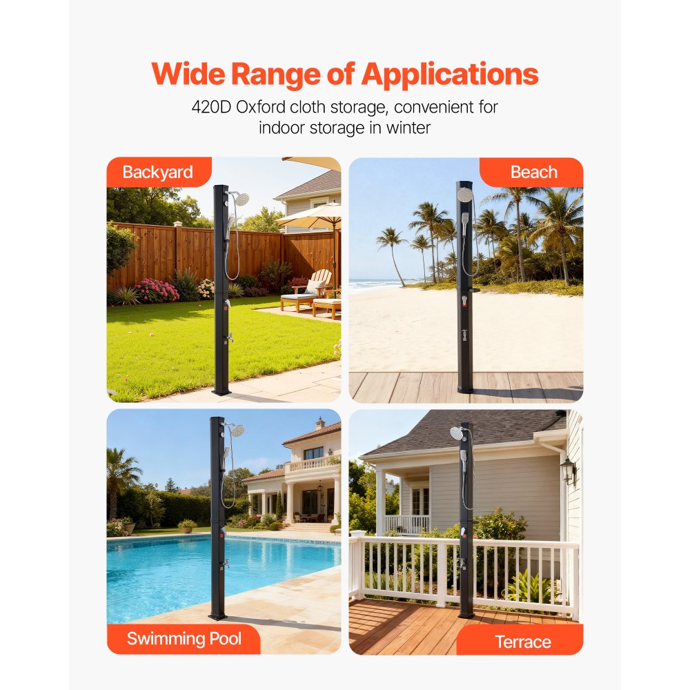 Ηλιακό θερμαινόμενο ντους 10,6 γαλονιών: Σχεδιασμένο για εξωτερικά ντους με ζεστό νερό που χρησιμοποιούν ηλιακή θερμότητα. Με χωρητικότητα 10,6 γαλονιών/40 λίτρων, προσφέρει ρυθμιζόμενο ζεστό και κρύο νερό για ιδανική εμπειρία εξωτερικού ντους. Σημείωση: Κατάλληλο μόνο για καλοκαίρι ή ζεστό φθινόπωρο, όχι για χειμερινή χρήση. Εύκολη χρήση: Διαθέτει κεφαλή ντους στο πάνω μέρος, ποδόλουτρο και ψεκαστήρα χειρός με πολλαπλές ρυθμίσεις ψεκασμού. Περιλαμβάνει ενσωματωμένο ράφι για προϊόντα περιποίησης και ενσωματωμένο θερμόμετρο (0-100°C / 40-200°F) για εύκολες μετρήσεις θερμοκρασίας. Έλεγχος θερμοκρασίας και ροής: Ρυθμίστε εύκολα τη θερμοκρασία και την πίεση του νερού. Υποστηρίζει πίεση 6 bar για γρήγορο ξέβγαλμα. Η βαλβίδα κρύου/ζεστού ρυθμίζεται έως και 60°C — ξεκινήστε από το κρύο (μπλε), γυρίστε αργά προς το ζεστό (κόκκινο) μέχρι να επιτευχθεί το επιθυμητό επίπεδο άνεσης. Ανθεκτική και σταθερή κατασκευή: Συμβατό με λάστιχο κήπου γρήγορης σύνδεσης. Διπλές θύρες εισόδου που πληρούν τα παγκόσμια πρότυπα σωλήνων. Η δεξαμενή από ενισχυμένο PVC αντέχει σε πίεση 6 bar. Σχεδιασμός δύο μερών για εύκολη συναρμολόγηση. Προαιρετικό κιτ αντιολισθητικού δαπέδου. Απολαύστε εξωτερικά ντους: Ιδανικά για ξέβγαλμα πριν/μετά το κολύμπι ή για δροσιά τις ζεστές μέρες. Ιδανικά για χρήση στην αυλή, την παραλία, την πισίνα ή το αίθριο. Διαθέτει κάλυμμα Oxford 420D για προστασία από τις καιρικές συνθήκες. Κατάλληλα και για εσωτερική αποθήκευση κατά τους κρύους μήνες.