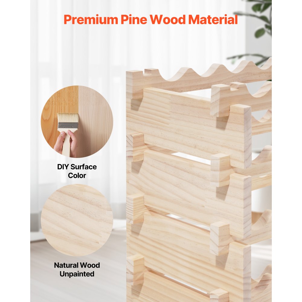 Μεγάλη χωρητικότητα: Με σχεδιασμό 8 επιπέδων που στοιβάζεται, αυτή η ανεξάρτητη, στοιβαζόμενη αρθρωτή θήκη κρασιών από πεύκο χωράει έως και 96 μπουκάλια. Το συνολικό μήκος της θήκης 44,5 ίντσες/1130 mm υποστηρίζει τη συνεχή τοποθέτηση μπουκαλιών Pinot Noir για αποθήκευση στο σπίτι. Ανθεκτική στήριξη: Με πλαϊνά πάνελ και σχάρες πάχους 0,8 ίντσας/20 χιλιοστών, οι εγκοπές και η αυλάκωση εφαρμόζουν σφιχτά για σταθερότητα και υψηλή χωρητικότητα φορτίου. Το ανεξάρτητο δάπεδο της σχάρας κρασιών μας αντέχει βάρος ≥ 246,9 λίβρες/112 κιλά (ανά επίπεδο ≥ 30,9 λίβρες/14 κιλά) και παραμένει σταθερό χωρίς ταλαντώσεις. Ευρεία συμβατότητα: Σχεδιασμένο για τυπικά μεγέθη, το ανεξάρτητο δάπεδο της ραφιέρας κρασιών ταιριάζει σε διάφορους τύπους κρασιών. Τα κυματοειδή τοξωτά ράφια διατηρούν τα μπουκάλια σταθερά και αντιολισθητικά, ενώ η ελαφριά κλίση εμπρός-πίσω διατηρεί τον φελλό υγρό και αποτρέπει την οξείδωση. Υλικό Πεύκου υψηλής ποιότητας: Η θήκη αποθήκευσης κρασιών μας διαθέτει μια λεπτώς τριμμένη, λεία επιφάνεια χωρίς γρέζια και είναι λιγότερο πιθανό να ραγίσει. Χωρίς φινίρισμα βαφής, η θήκη σε χρώμα πεύκου επιτρέπει το DIY χρωματισμό να συμπληρώσει την τραπεζαρία, την κουζίνα ή την κάβα σας. Εύκολη συναρμολόγηση: Με αρθρωτό, στοιβαζόμενο σχεδιασμό, αυτή η θήκη κελαριού κρασιών συναρμολογείται σε λίγα λεπτά—δεν απαιτούνται εργαλεία ή καρφιά. Απλώς κουμπώστε τις εγκοπές και τις αυλακώσεις μεταξύ τους. Αποσυναρμολογείται εξίσου εύκολα για αποθήκευση.