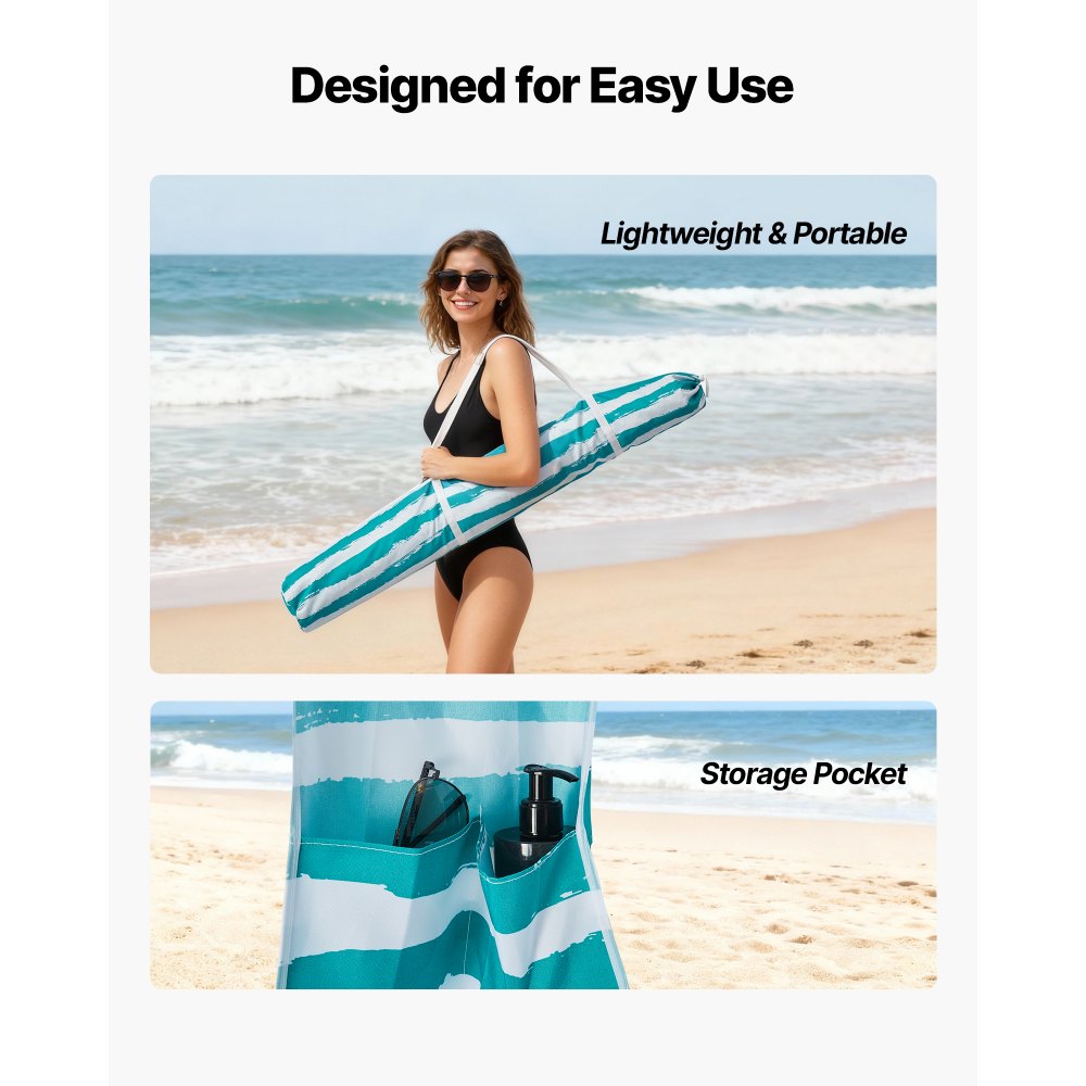 Καμπάνα παραλίας 6 x 6 ποδιών: Αυτή η ευρύχωρη καμπάνα παραλίας με πλαϊνή κουρτίνα φιλοξενεί άνετα δύο άτομα, καρέκλες και εξοπλισμό. Σχεδιασμένη με τσέπες αποθήκευσης, διατηρεί τα τηλέφωνα, τα γυαλιά ηλίου και το αντηλιακό σε κοντινή απόσταση. Αντηλιακή προστασία UPF 50+: Κατασκευασμένη από ύφασμα ανθεκτικό στον ήλιο 140 g/m², η σκηνή παραλίας Cabana προσφέρει σκιά και μειώνει τον κίνδυνο ηλιακού εγκαύματος. Η πλαϊνή κουρτίνα διαθέτει αναπνεύσιμο πλέγμα, που προάγει τη ροή του αέρα και απωθεί τη θερμότητα, δημιουργώντας ένα πιο δροσερό περιβάλλον. Αντοχή στον άνεμο: Εξοπλισμένη με ένα στιβαρό πλαίσιο από υαλοβάμβακα, έναν βιδωτό κύριο στύλο, σακιά με άμμο και πασσάλους εδάφους, αυτή η μεγάλη καμπάνα παραλίας παραμένει σταθερά αγκυρωμένη στην άμμο. Αντέχει στην κατάρρευση ή την απομάκρυνση από τον άνεμο, ακόμη και κάτω από ελαφριά θαλασσινή αύρα. Αποσπώμενη πλαϊνή κουρτίνα: Η αποσπώμενη πλαϊνή κουρτίνα παρέχει ευέλικτη σκιά και ιδιωτικότητα. Αποσπάστε την εύκολα για εξωτερικό αερισμό ή στερεώστε την για πλήρη προστασία από τον ήλιο και τον άνεμο κάτω από την εύκολη στησίματή σας σκηνή καμπάνα. Γρήγορη και εύκολη εγκατάσταση: Ένα άτομο μπορεί να στήσει αυτή τη σκηνή καμπάνα σε τρία έως τέσσερα λεπτά χωρίς ειδικά εργαλεία. Διαθέτει μια συμπαγή τσάντα μεταφοράς με ιμάντα ώμου, γεγονός που την καθιστά ελαφριά και εύκολη στη μεταφορά στην παραλία.