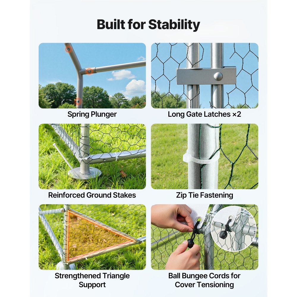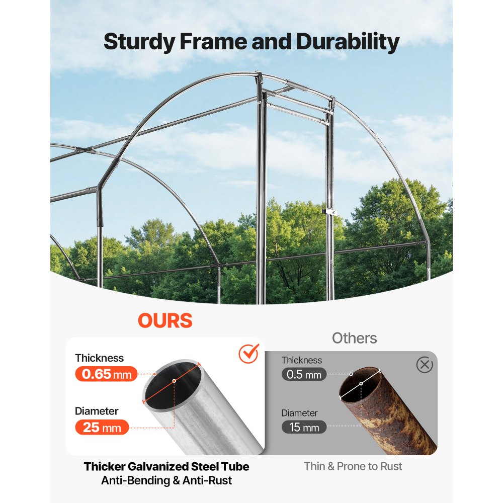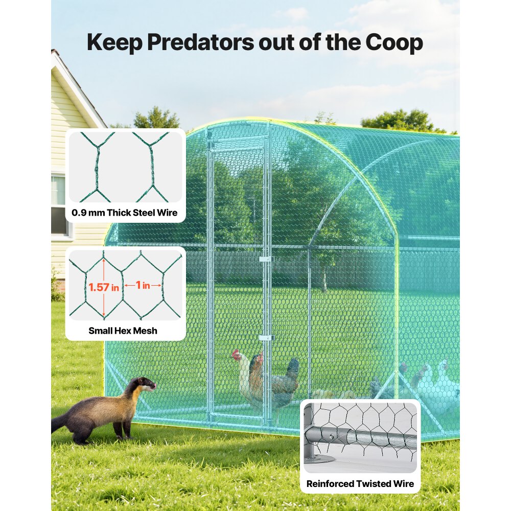 Ευρύχωρος σχεδιασμός με δυνατότητα εντοιχισμού: Το μεγάλο κοτέτσι διαθέτει ευρύχωρο εσωτερικό που επιτρέπει στις κότες να κινούνται ελεύθερα. Ο ψηλός σχεδιασμός παρέχει εύκολη πρόσβαση για τάισμα και καθάρισμα. Τα ανοιχτά τοιχώματα από πλέγμα εξασφαλίζουν εξαιρετικό αερισμό. Κατάλληλο για πάπιες και κουνέλια. Ενισχυμένο γαλβανισμένο ατσάλινο πλαίσιο: Κατασκευασμένο από γαλβανισμένο ατσάλι ανθεκτικό στη διάβρωση και αγκυρωμένο με πασσάλους εδάφους για σταθερότητα. Αυτό το κοτέτσι είναι κατασκευασμένο για να αντέχει σε ισχυρούς ανέμους, έντονο χιόνι και σκληρές καιρικές συνθήκες για μακροχρόνια ανθεκτικότητα. Βελτιωμένο καταφύγιο: Το κοτέτσι μας με χοντρό εξαγωνικό συρμάτινο πλέγμα που ασφαλίζεται με φερμουάρ εμποδίζει τη διαφυγή των πουλερικών. Ο πάτος διαθέτει σπειροειδές σύρμα και εκτεταμένα μάνδαλα πόρτας για να αποτρέπουν τα αρπακτικά ζώα όπως τα ρακούν και οι αλεπούδες από το να εισβάλουν. Καταφύγιο παντός καιρού: Αυτό το μεταλλικό κοτέτσι διαθέτει στέγη από πολυαιθυλένιο που μπορεί να εγκατασταθεί γρήγορα, προσφέροντας σκιά τις ηλιόλουστες ημέρες και στεγνό καταφύγιο κατά τη διάρκεια ξαφνικής βροχής. Ο σχεδιασμός με θόλο αποτρέπει την ανύψωση του ανέμου και αποστραγγίζει αποτελεσματικά το νερό και τα υπολείμματα. Εύκολη συναρμολόγηση: Ο διάδρομος για κοτόπουλα με θολωτή οροφή για την αυλή περιλαμβάνει όλα τα απαραίτητα αξεσουάρ - γάντια, πασσάλους εδάφους και φερμουάρ. Σχεδιασμένο για δύο άτομα και μπορεί να συναρμολογηθεί σε περίπου 3-4 ώρες.
