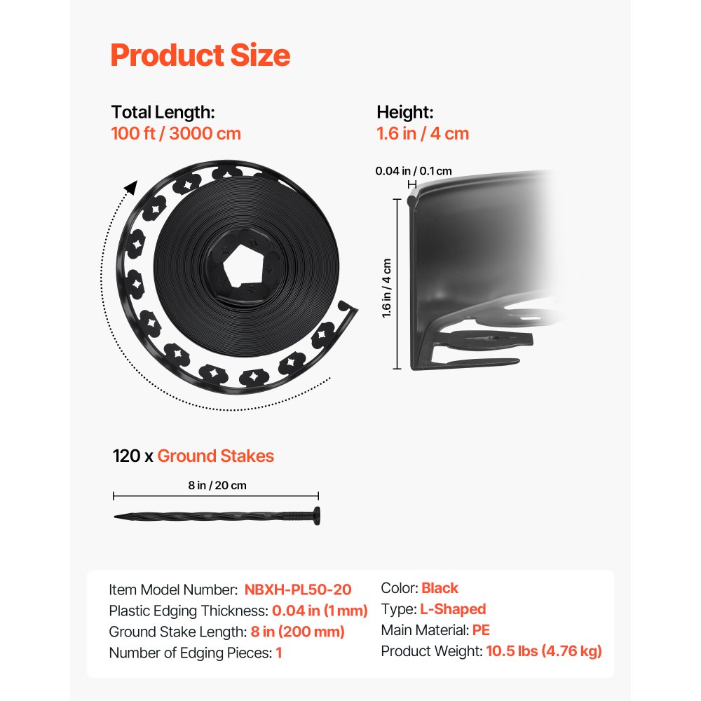 Τύπος: Σχήμα LΑριθμός τεμαχίων μπορντούρας: 1Χρώμα: ΜαύροΚύριο υλικό: PEΔιαστάσεις πλαστικού περιγράμματος: 100 πόδια x 1,6 ίντσες (3000 x 4 εκ.)Πάχος πλαστικής μπορντούρας: 0,04 ίντσες (1 mm)Μήκος πασσάλου εδάφους: 8 ίντσες (200 mm)