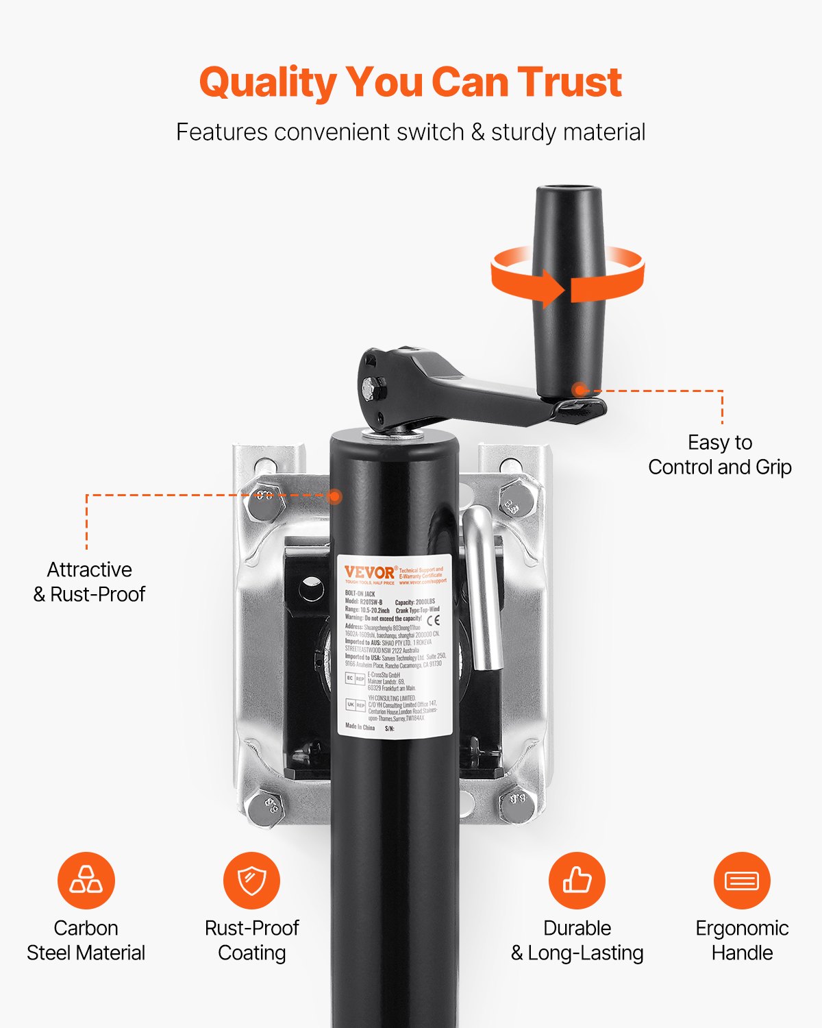 Χωρητικότητα φορτίου βαρέως τύπου: Ο γρύλος τρέιλερ διαθέτει εντυπωσιακή ανυψωτική ικανότητα 2000 lbs, καθιστώντας το ένα ισχυρό εργαλείο για εργασίες ανύψωσης. Με εύρος ανύψωσης από 10,5 έως 20,2 ίντσες, ταιριάζει τόσο σε ρυμουλκούμενα υψηλού προφίλ όσο και σε ρυμουλκούμενα χαμηλού προφίλ.