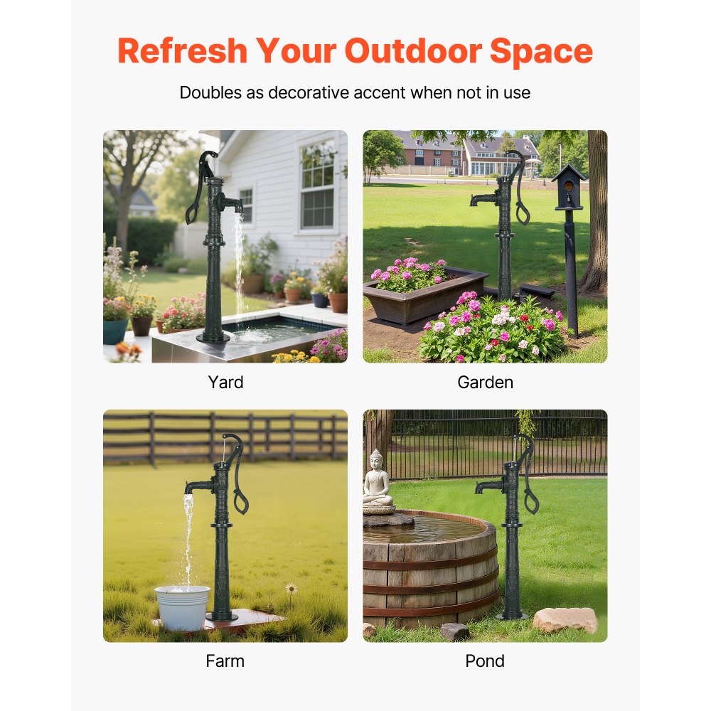 Διαχρονικό vintage στυλ: Αυτή η χειροκίνητη αντλία κανάτας διαθέτει κλασικό ρετρό σχεδιασμό, ιδανική για άντληση σε λίμνες, πηγάδια, κήπους, κάμπινγκ, αυλές, αγροκτήματα και πάρκα. Διακοσμητική και πρακτική, χρησιμεύει ως όμορφη διακόσμηση κήπου όταν δεν χρησιμοποιείται. Αποδοτική άντληση νερού: Σχεδιασμένη για ρηχά πηγάδια ή σημεία γεώτρησης, αυτή η χειροκίνητη αντλία νερού από χυτοσίδηρο ανυψώνει νερό από βάθη έως και 20 πόδια. Κατάλληλη για τα περισσότερα επίπεδα υπόγειων υδάτων. Δεν απαιτείται ηλεκτρικό ρεύμα, απλώς εγκαταστήστε και ξεκινήστε την άντληση. Ανθεκτική κατασκευή από χυτοσίδηρο: Κατασκευασμένη από χυτοσίδηρο με επίστρωση ανθεκτική στη σκουριά, η αντλία κανάτας μας είναι κατασκευασμένη για να αντέχει. Ο παχύς σωλήνας αντέχει έως και 9 κιλά κρούσης με σφυρί, αντέχοντας σε σκληρές εξωτερικές συνθήκες όπως βροχή, χιόνι, ζέστη και παγωμένο κρύο. Λαβή που Εξοικονομεί Κόπο: Κατασκευασμένη για να ταιριάζει στην καμπύλη της παλάμης, αυτή η αντλία κανάτας για πηγάδι διαθέτει λαβή που εξοικονομεί χρόνο, καθιστώντας την αντλία ομαλή και χωρίς καταπόνηση, ακόμα και μετά από επαναλαμβανόμενη χρήση. Επιπλέον, ο σχεδιασμός με γάντζο στομίου σάς επιτρέπει να κρεμάτε έναν κουβά με ασφάλεια χωρίς πιτσιλίσματα. Εύκολη εγκατάσταση: Εξοπλισμένη με στάνταρ σύνδεση NPT 1-1/4, αυτή η χειροκίνητη αντλία νερού εγκαθίσταται σε μόλις 2-3 λεπτά χρησιμοποιώντας μόνο ένα κατσαβίδι. Μόλις εγκατασταθεί, απλώς κρατήστε τη λαβή πάνω-κάτω και έχετε νερό όποτε το χρειάζεστε.